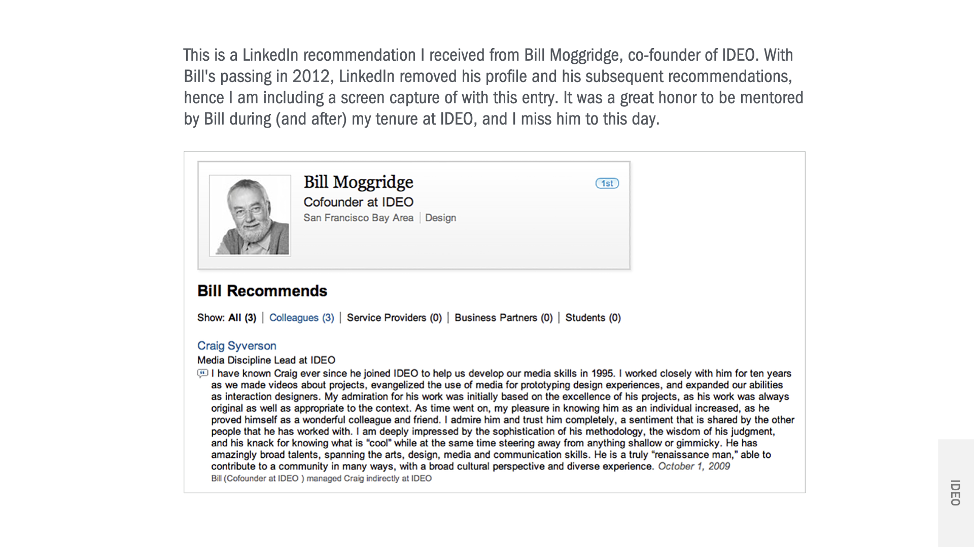 I reported directly to CEO and kept the division in the black from the first year. Our group was also responsible for all internally-created media representations of IDEO and worked directly with the Marketing and Communications group on the strategic direction of the company brand. We also produced promotional videos for annual design awards competition, providing a key element that enabled IDEO to reach the #1 position every year.