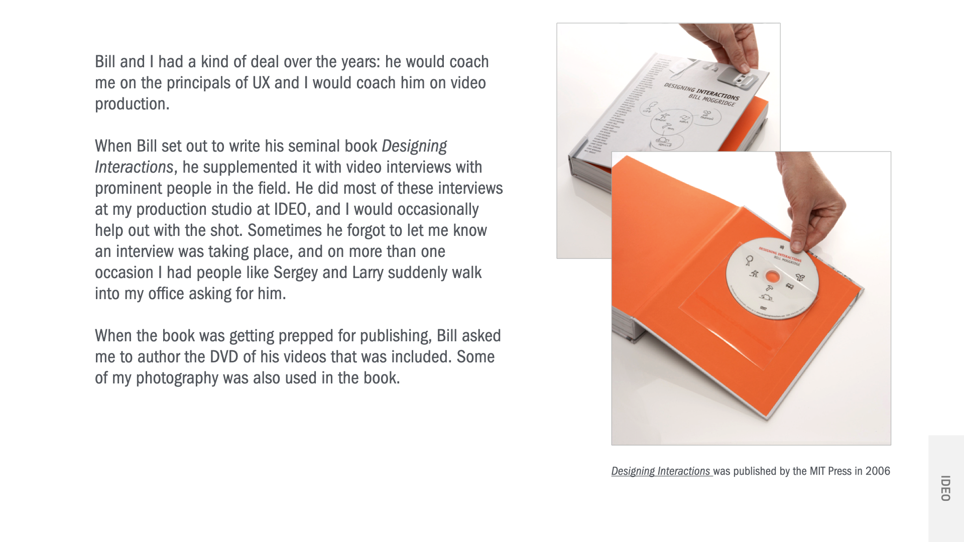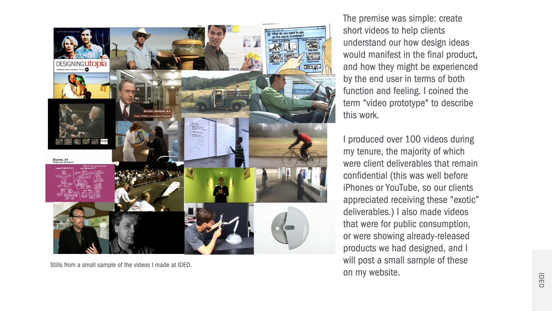I conceived and lead IDEO's in-house media production division, which is currently called the Storytelling Discipline. We focussed on creating short videos to help clients understand our how design ideas would manifest in the final product, and how they might be experienced by the user in terms of both function and feeling. I coined the term “video prototype" to describe this work. While I managed group of videographers and an in-house production and photography studio, I also performed all aspects of video production, from concept to shooting to distribution.
